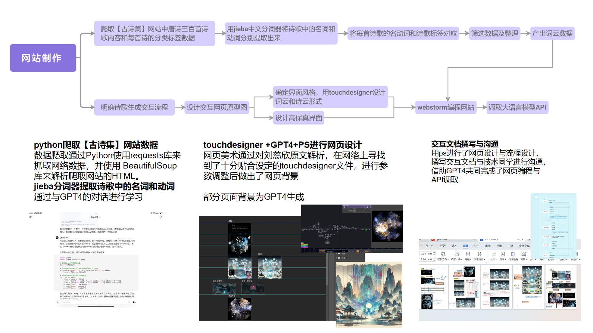 这个项目中,我在古诗集网站上爬取了唐诗三百首的所有诗歌内容和对应标签,并拆解出其中的名词和动词,由此创建了一种有趣的AI生成诗歌方式:用户可以通过选择喜欢的词汇,再选择它们对应的标签来进行诗歌生成。